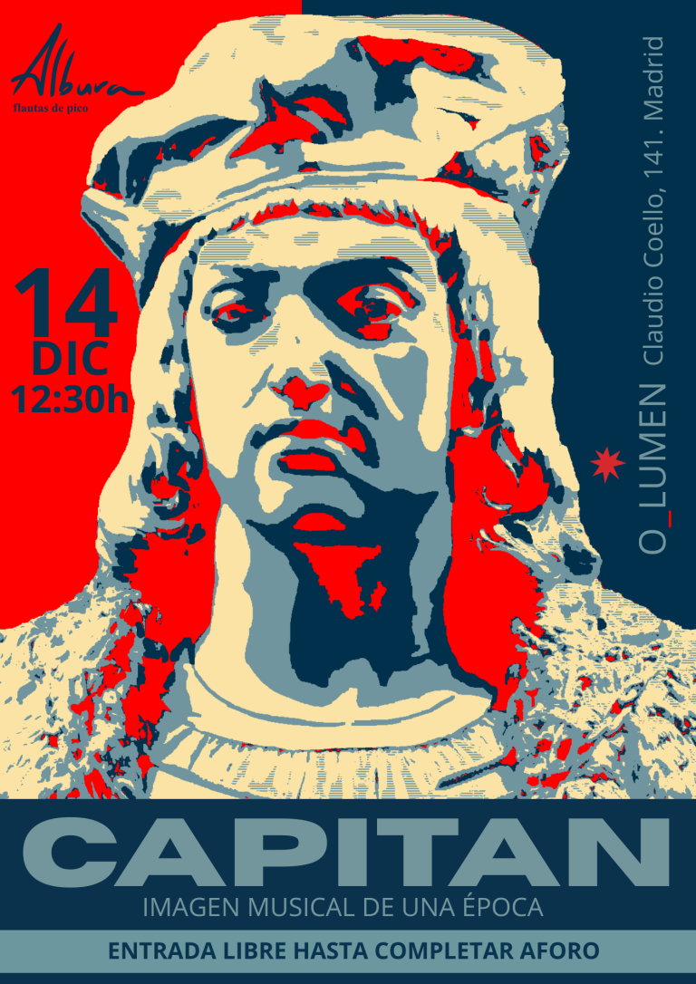 Este concierto rinde homenaje a uno de los más grandes héroes de la historia de España, Gonzalo Fernández de Córdoba, El Gran Capitán. A través de una cuidadosa selección de obras del Renacimiento y del Barroco, el Conjunto Albura Flautas de Pico nos invita a revivir el esplendor de la época de los Reyes Católicos, una era en la que la música y las gestas militares se entrelazaron. El conjunto, con su formato de consort de flautas de pico acompañado de cuerdas y percusión, más la presencia de la voz, ofrece una interpretación histórica que evoca tanto las hazañas de El Gran Capitán como el contexto musical de su tiempo.